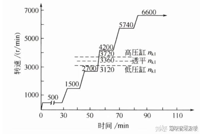 (如圖1所示的空氣壓縮機(jī)升速曲線)。在升速同時(shí)對(duì)機(jī)組運(yùn)行情況進(jìn)行全面檢查,一切正常才可繼續(xù)升速,直到調(diào)速器起作用的最低轉(zhuǎn)速(設(shè)計(jì)轉(zhuǎn)速的85%左右)。通過臨界轉(zhuǎn)速要適當(dāng)迅速,嚴(yán)密注意機(jī)組的振動(dòng)情況。